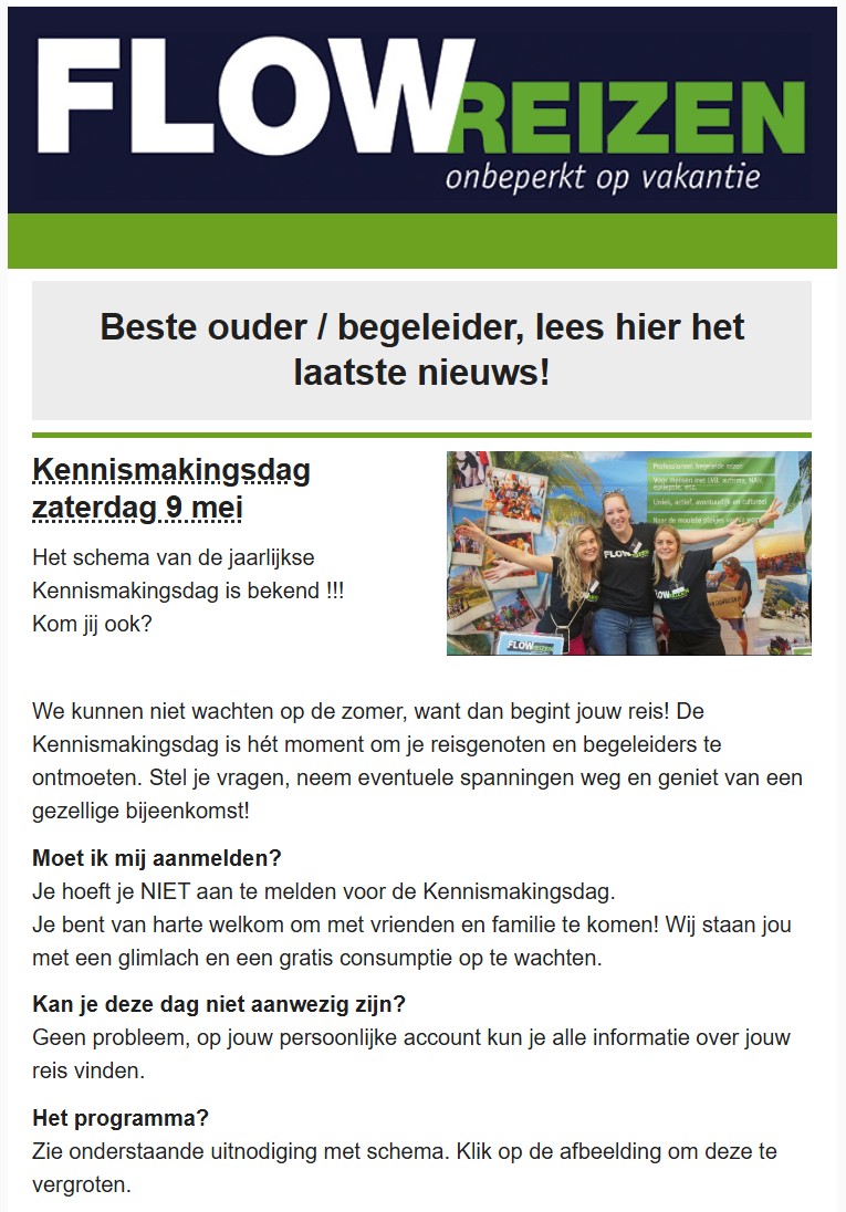 Neem contact op met Flow ReizenFlow Reizen stuurt regelmatig nieuwsbrieven om iedereen op de hoogte te houden van het laatste nieuws.