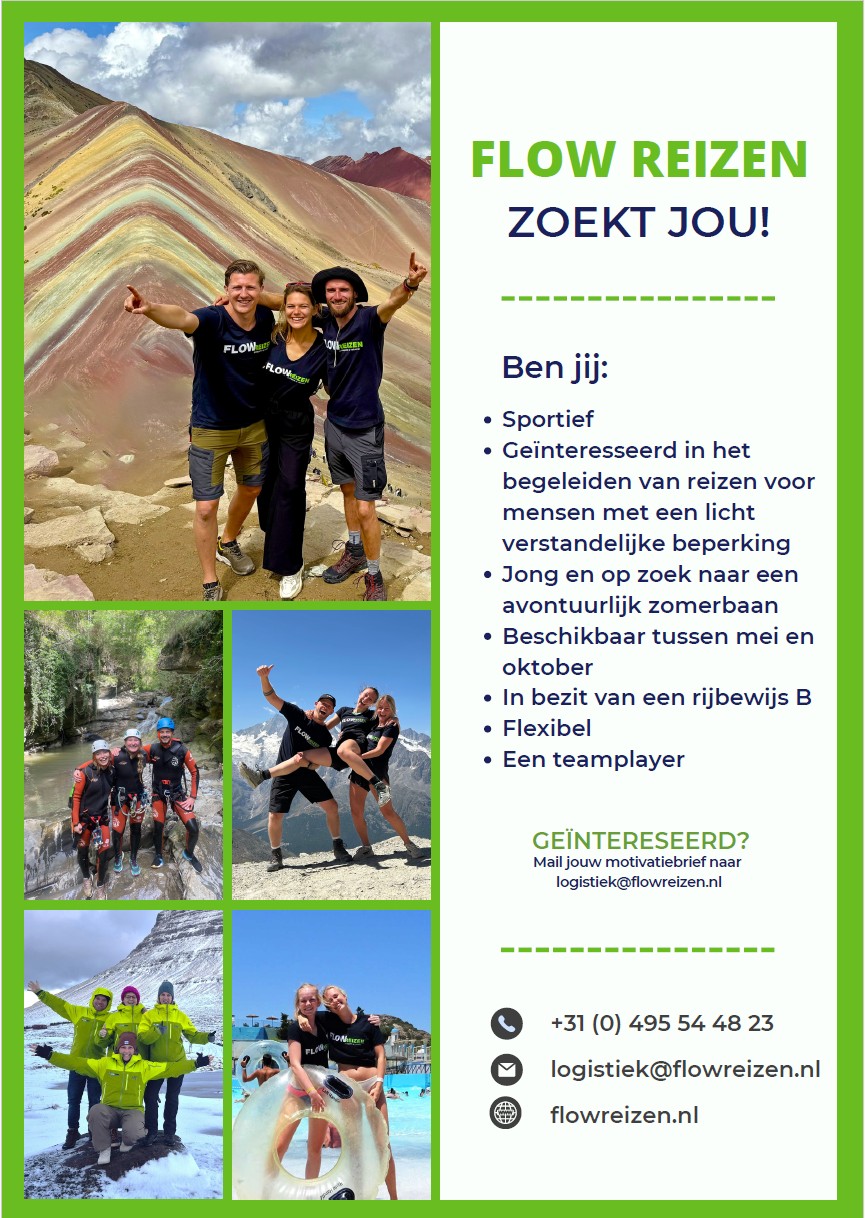 Neem contact op met Flow ReizenWil jij avontuurlijke reizen begeleiden en anderen een onvergetelijke en onbeperkte vakantie bezorgen?