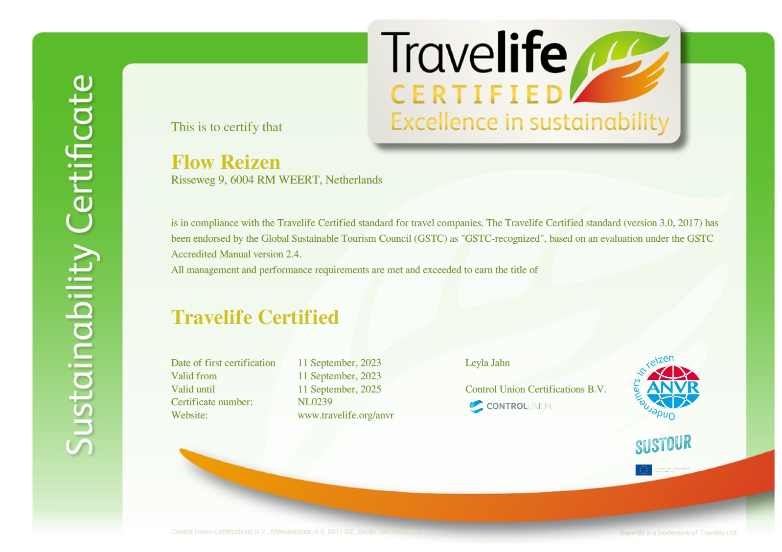 Zie hieronder het Travelife Certificaat die Flow Reizen heeft ontvangen:
