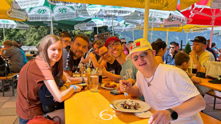 We rijden met minibusjes naar Oostenrijk, met een tussenovernachting in een motel in Duitsland. We stoppen regelmatig voor een pauze en om van chauffeur te wisselen.