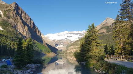 Je volgende stop: Lake Louise met het adembenemende turquoise water. Gevoed door de nabijgelegen Victoria-gletsjer, komt de verbluffende kleur van het water van fijn gletsjersediment, of 'rotsmeel', dat in het water hangt. Het meer ligt tegen een achtergrond van hoge toppen en het majestueuze Fairmont Chateau Lake Louise, waardoor een werkelijk iconische Canadese Rockies-scène ontstaat.