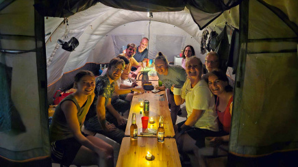 Een eigen tent kan alleen op aanvraag en de kosten zijn € 350,-. Dat is inclusief een 1-persoonskamer op de heen- en terugreis. We hebben 3 eenpersoonstenten ter beschikking ivm de beschikbare kampeerruimte.