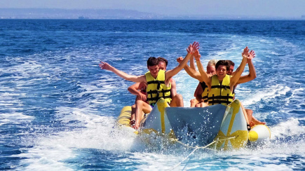 - Stranddagen met veel zonnen, zwemmen en watersporten, zoals snorkelen, parasailen en bananenbootvaren